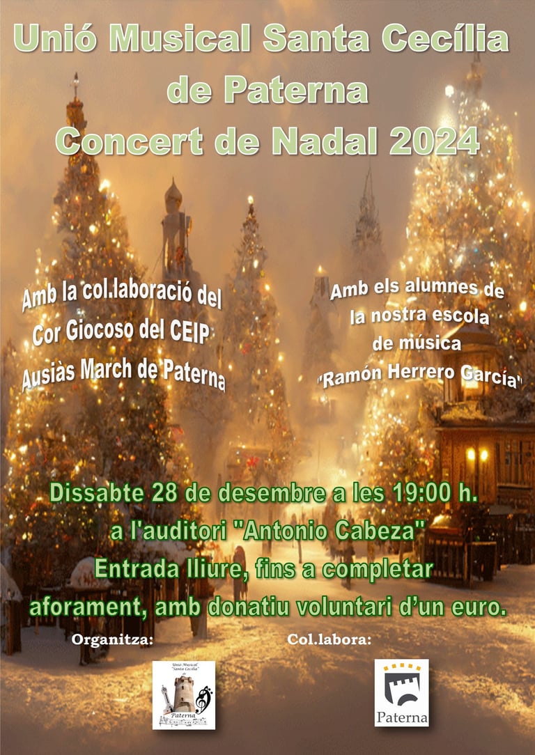 Sábado 28 de diciembre, a las 1900 h. en el Auditorio Antonio Cabeza, tradicional Concierto de Navidad de nuestra Banda Sinfónica acompañados por el Cor Giocoso del CEIP Ausiàs March de Paterna, y por los alumnos de nuestra escuela de música.